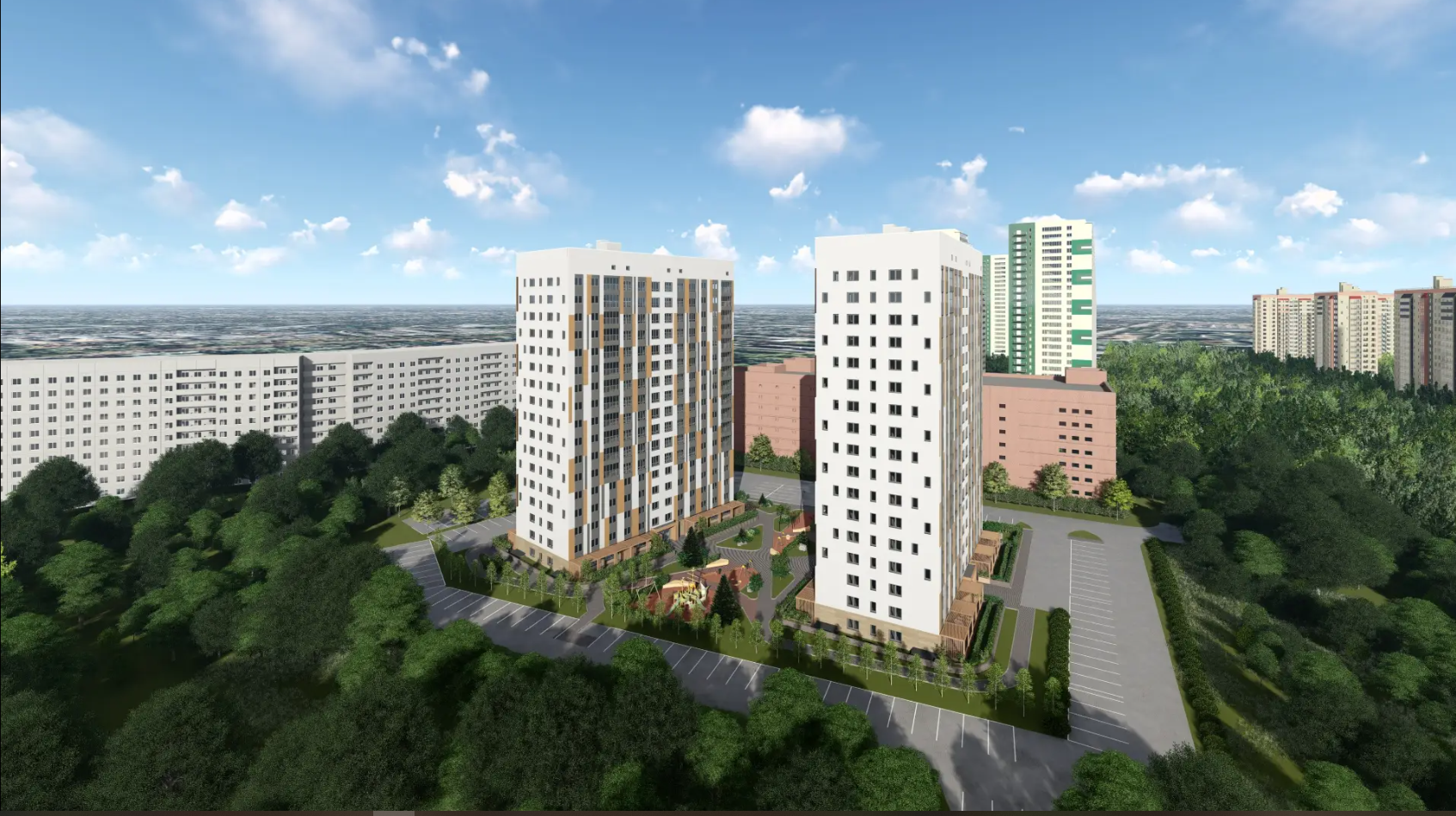 Жилой комплекс задуман как квартал с домами различной этажности. Отдельные дома будут выделяться своими силуэтами на фоне окружающей природной среды.