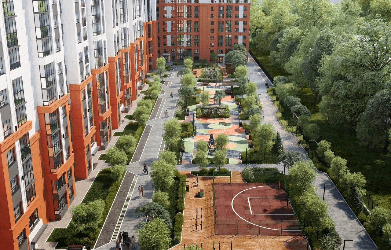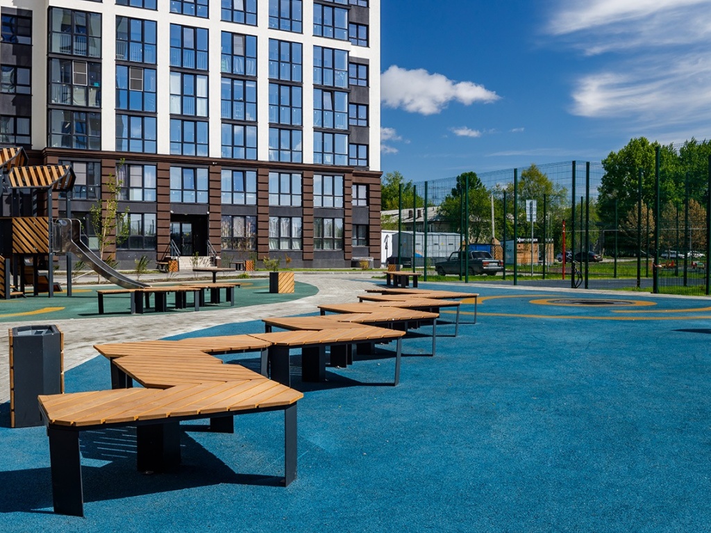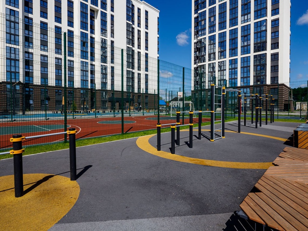 Для тех, кто устал от городской суеты, комплекс предлагает спокойную зону отдыха, где можно расслабиться с книгой или насладиться тишиной, а также дорожки для спокойных прогулок среди деревьев. Для активного отдыха в комплексе есть спортивные площадки с безопасным покрытием, а для детей спроектированы игровые площадки, также оборудованные безопасным резиновым покрытием.