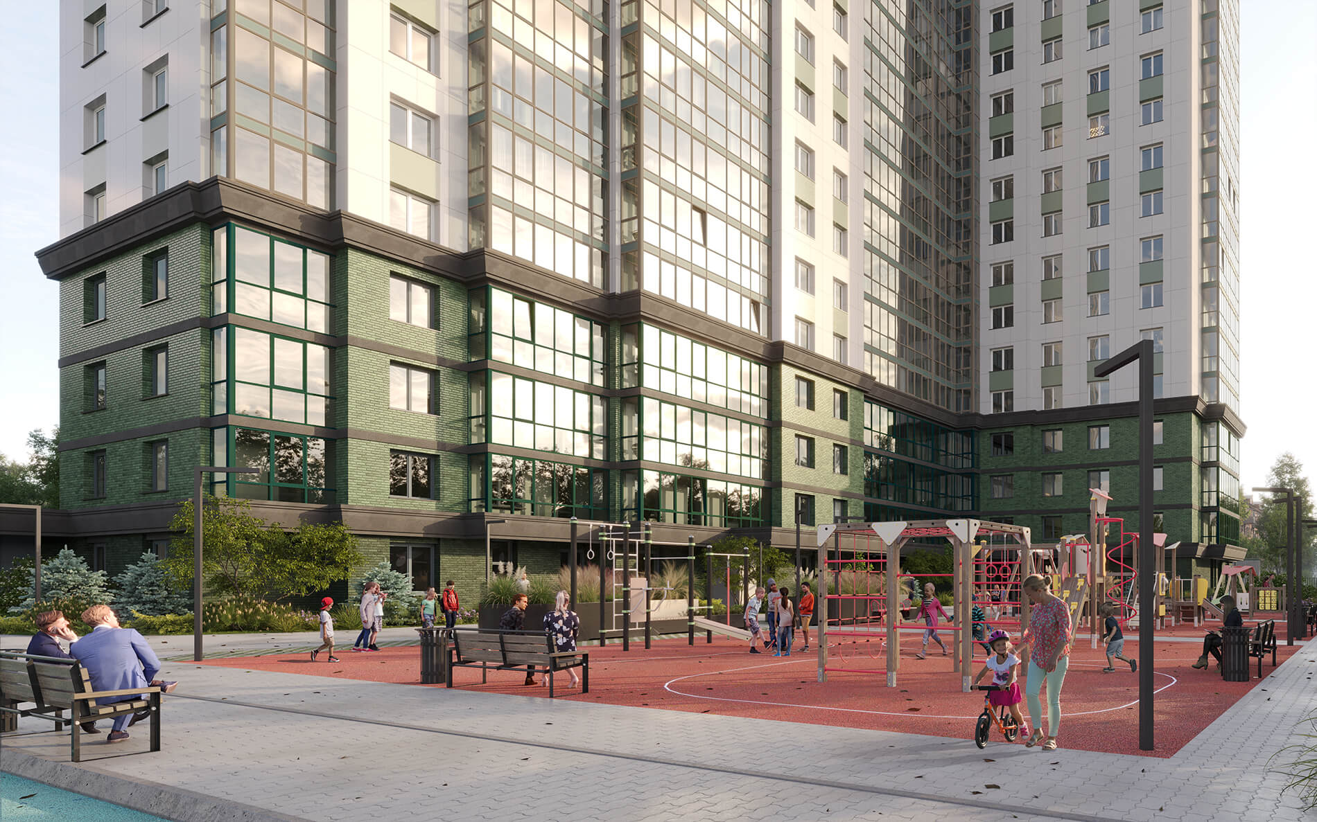 Для личного автотранспорта и хранения сезонных вещей в доме предусмотрен подземный паркинг и келлеры. В паркинг можно спуститься на лифте со своего этажа. Под благоустройство и озеленение отведен внутренний двор на котором расположены зоны для активных игр, занятий спортом и тихого отдыха. Безопасность городских резиденций обеспечивает закрытый периметр с умной системой круглосуточного видеонаблюдения.