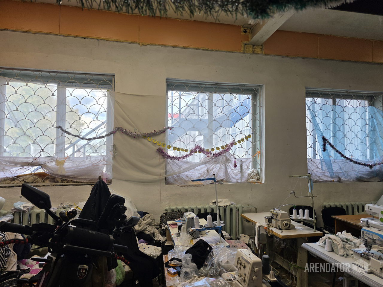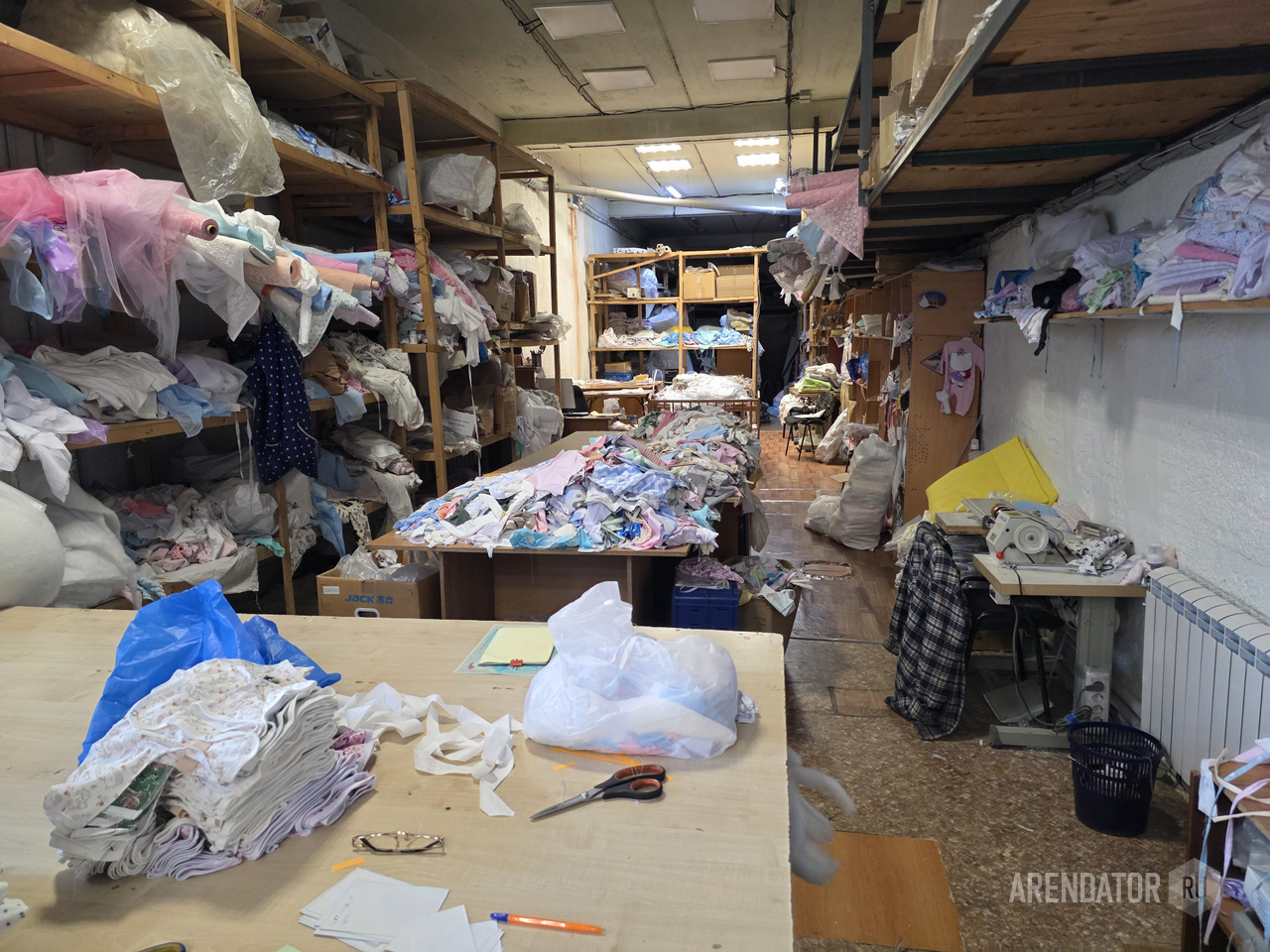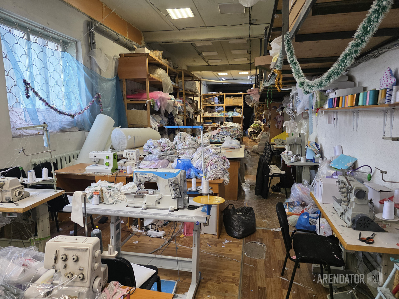 Швейный цех (склад): пол деревянный по старому бетонному основанию, потолок и стены побелка, пластиковые окна.